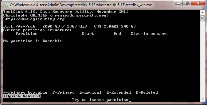 Starte Testdisk bestätige bei dem Log-Datei-Screen mit Enter, wähle deine betroffene Festplatte aus und bestätige mit Enter, bestätige bei Partition Table Typ Intel, bestätige bei Analyse mit Enter und setze mir einen Screenshot.