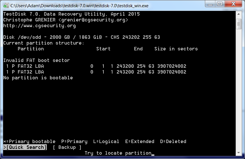 Ich versuche meine HDD mit TestDisk zu retten. Leider klappt es nicht so wie es in der Beschreibung steht.