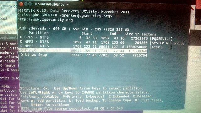 * I now wanted to get my Ubuntu back. I used liveCD to 'try Ubuntu' + install + run testdisk. Here, testdisk did find my Linux partition. I went down the directories in testdisc to make sure, filenames did show up!